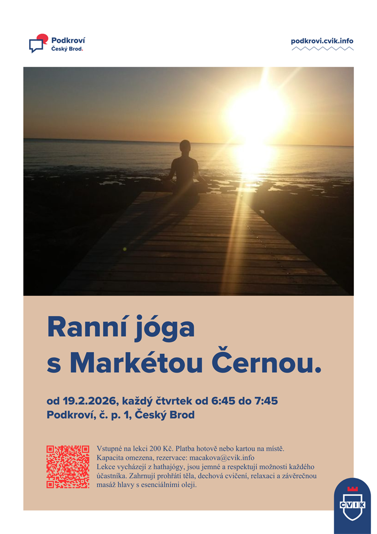 Ranní jóga pro dospělé s Markétou Černou v inspirativním prostoru Podkroví. Jemná hathajóga, dech, hluboké uvolnění a energie do celého dne. Každý čtvrtek od 6:45.